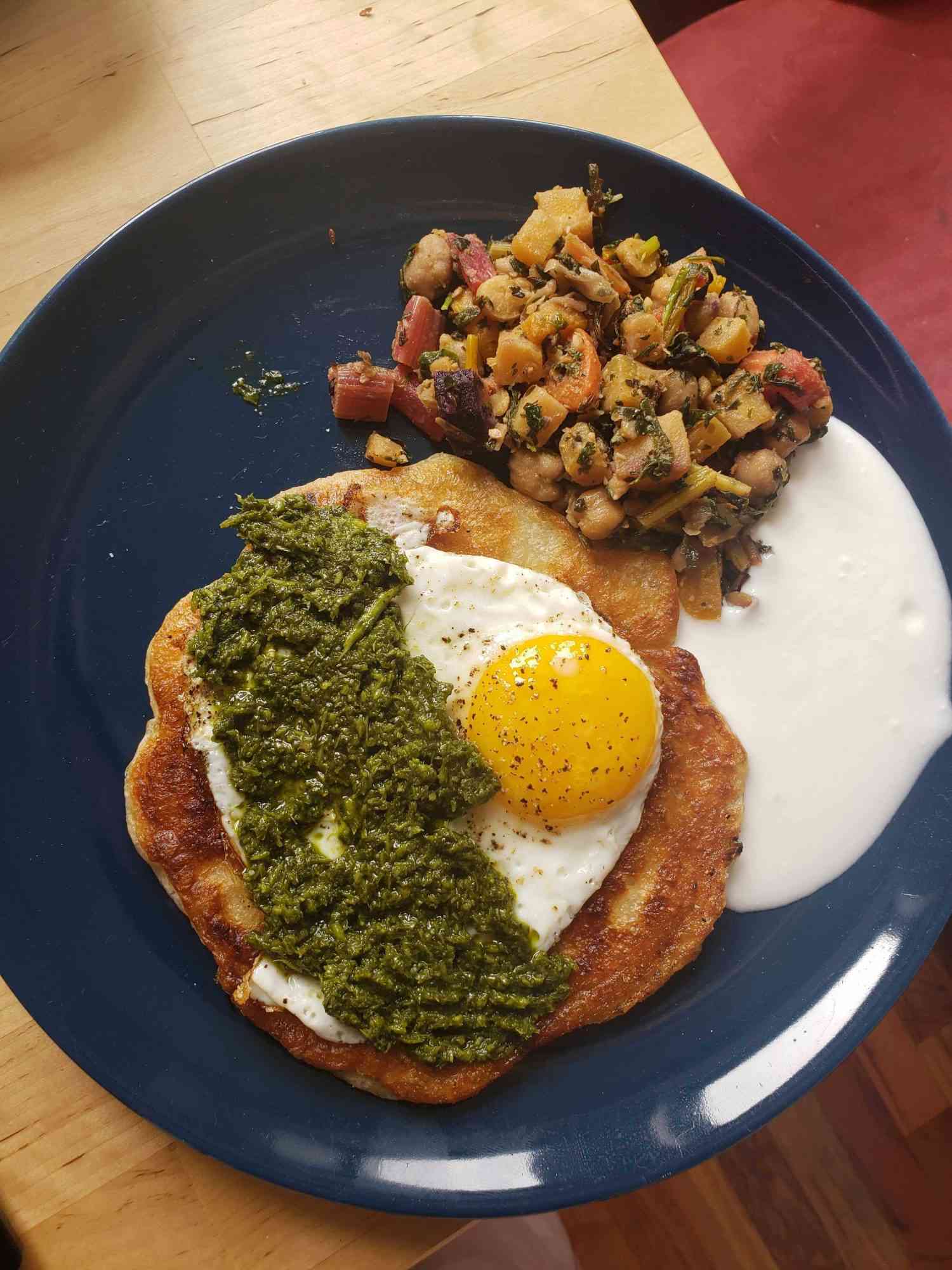 "Sourdough scallion pancake, chickpea/carrot/chard sauté, homemade yogurt, and salsa verde."