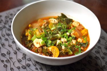 Add miso paste to pot and incorporate into broth by pressing miso paste against edge of soup pot. Simmer for 5 minutes longer, until frog flesh is cooked through but still very tender. Add wakame to pot and let soften in broth.