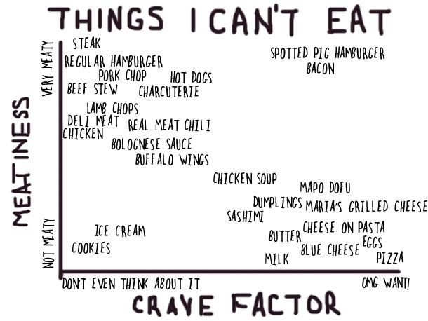 If any of you ever decide to take the plunge and try out a meat-free diet (I encourage every one of you to try it—you may surprise yourselves), I'd suggest making a similar chart for yourselves to help gauge your own desires and whether they match up with your lifestyle.