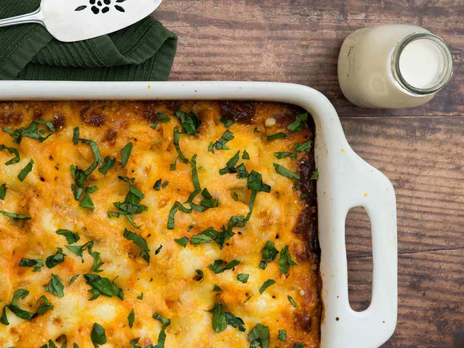 How does it work? Much like other recently popular recipes where pasta is cooked in sauce rather than boiling water, here the pasta cooks in the oven in a mixture of sauce and milk, plus eggs and plenty of cheese. The milk, tomato sauce, and ricotta keep the pasta moist yet perfectly al dente and deeply flavorful. Diced and shredded mozzarella lend that ooey-gooey quality that’s a requirement for truly exceptional baked ziti, and the eggs help hold the whole thing together.