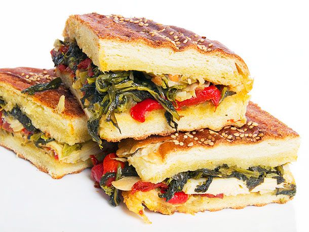 J. Kenji Lopez-Alt Juicy, garlicky broccoli rabe braised in a dry white wine provide moisture and texture; roasted peppers add a bit of fruity tartness and smoky depth; marinated artichoke hearts are herbal and funky; and sun-dried tomatoes have that dried fruit thing going. Stick'em together, and—hey!—you got something that works just as well as the original muffuletta and for all the same reasons, while simultaneously being brand new.
