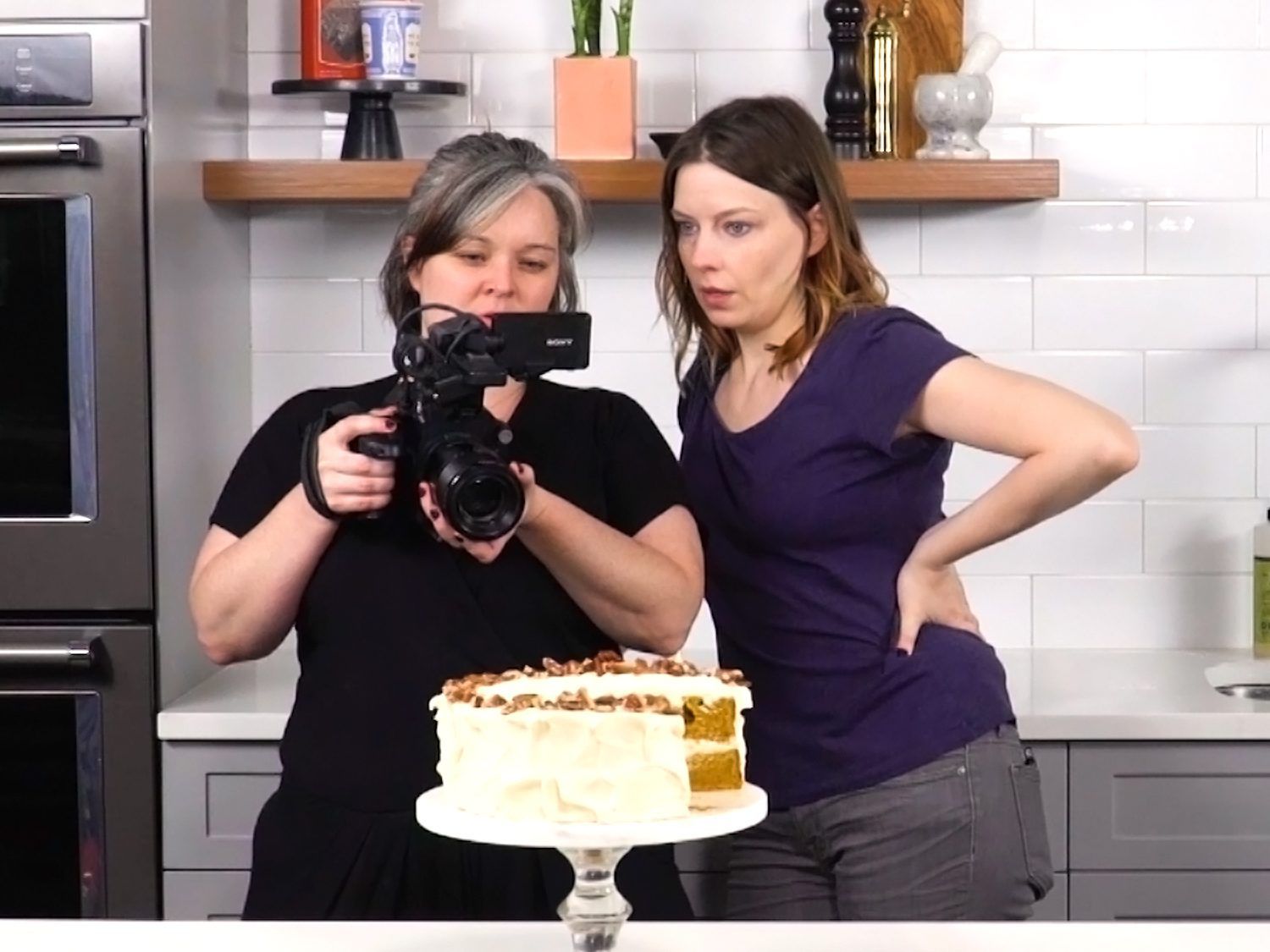 But really, we did more than "make it work." I convinced her that a shot of falling sugar was necessary for the recipe. She trained me to recognize the hallmarks of a perfect crumb, so I could focus on what made a bread or cake or scone successful. While she used to be repulsed at the idea of taking a break from baking even to eat lunch, she now gets as excited as I do to shut down the set for 20 minutes to create a perfectly dark environment for a timelapse of bagels baking in the oven.