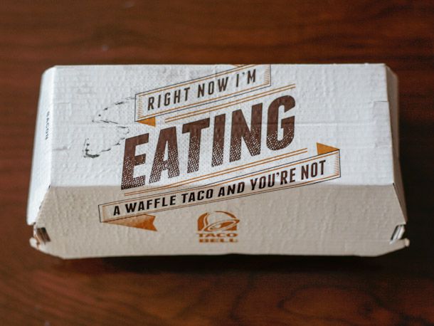 The box says, "Right now I'm eating a waffle taco and you're not." This is to incite jealousy so that a person who is not eating a waffle taco will feel the need to get one, too.