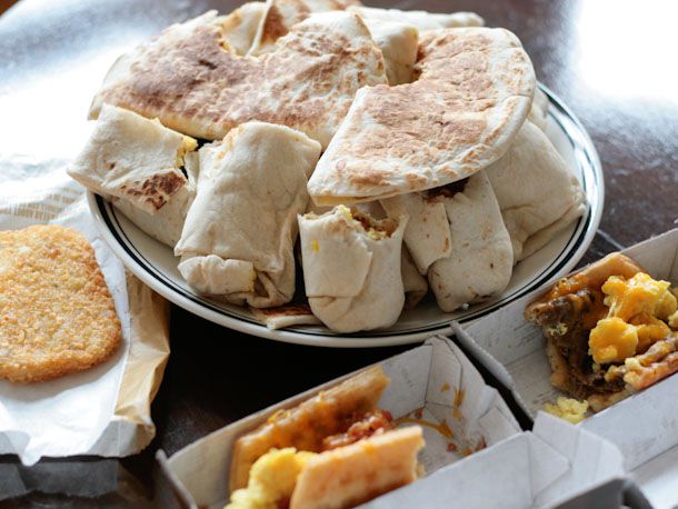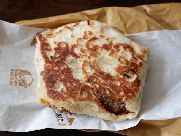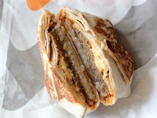 This half-moon quesadilla-looking thing is actually a grilled taco. It's stuffed with eggs, bacon or sausage, and cheese, before it's pressed on a grill.