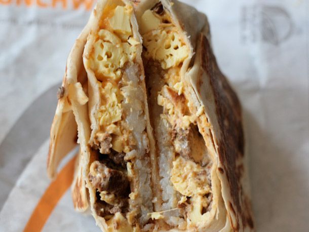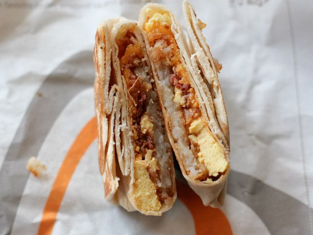 I was prepared to hate the idea of the A.M. Crunchwrap, since I don't like extra starch (rice, specifically) inside my burritos. But it turns out I'm totally cool with a hash brown inside a UFO of fast food engineering. Even though it sounds like overkill, the hash brown adds some satisfying heft to something that would otherwise be little more than a flat breakfast burrito.