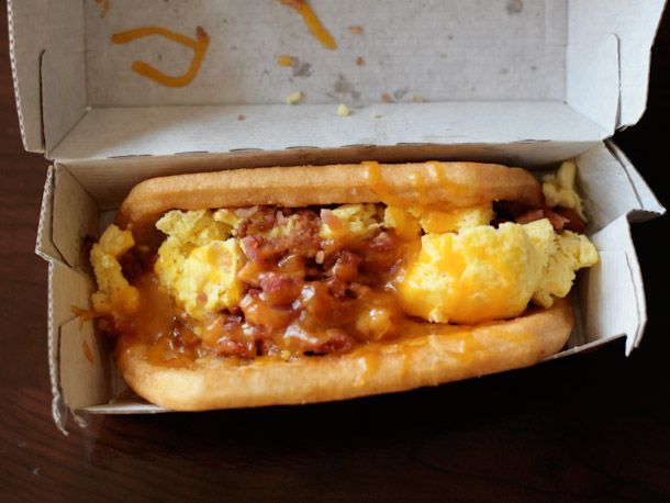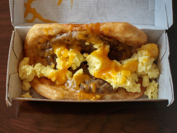 BUT the waffle is only a waffle in shape—it actually tastes more like frybread, crisp and oily on the outside, chewy on the inside. And while it's sturdy enough to hold together while you're eating it, it's also really, really, oily, which is a ding against it. The sausage patty is dense, salty, and surprisingly delicious, while the powdered and reconstituted eggs serve their purpose, but don't have much flavor. It's much better with the maple-flavored syrup poured on top for some extra punch.