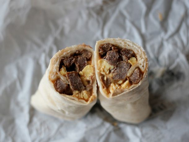 The breakfast version starts with the same tortilla, but it's layered with a whole hash brown, a meat of your choosing (bacon, sausage, or steak), scrambled eggs, cheese, and creamy jalapeño sauce.