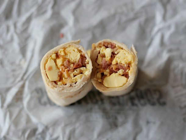 Again, this is pretty much what you'd expect. It's eggs, bacon, and cheese, all wrapped tightly in a soft flour tortilla. If you've ever been to a hotel buffet and seen breakfast burritos in the heated pans, these aren't much different. Plain eggs, salty bits of smoky bacon, and a small amount of cheese to glue it all together.