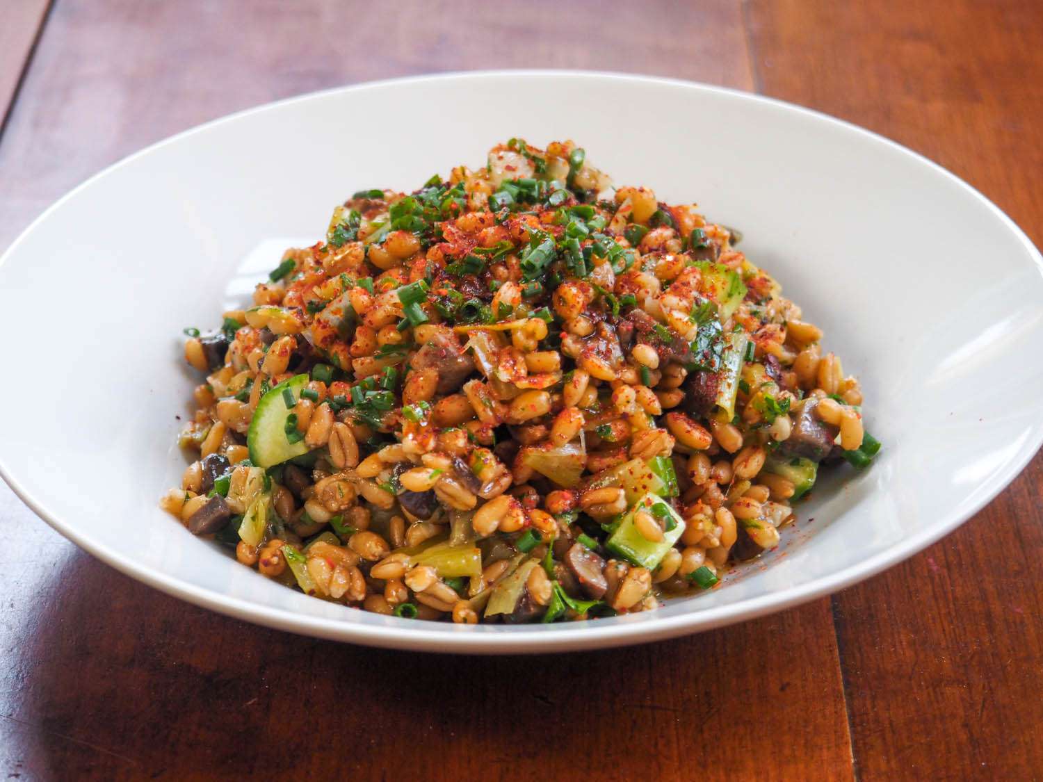 Well, earlier this week, after testing whether a pressure cooker is the best tool for cooking grains, I ended up with a lot of leftover whole grains on my hands. So Max and I teamed up to turn the bounty into two delicious and robust salads. I love to eat these kinds of dishes year-round, but I especially love them in the summer, when I cook up a big pot of the grains on the weekend, then keep them in the fridge for the remainder of the week, whipping up a different salad each night. They're filling without being heavy, and, aside from the initial boiling of the grains, require a minimum of cooking, which is welcome this time of year, when my kitchen swelters even without the stove on.